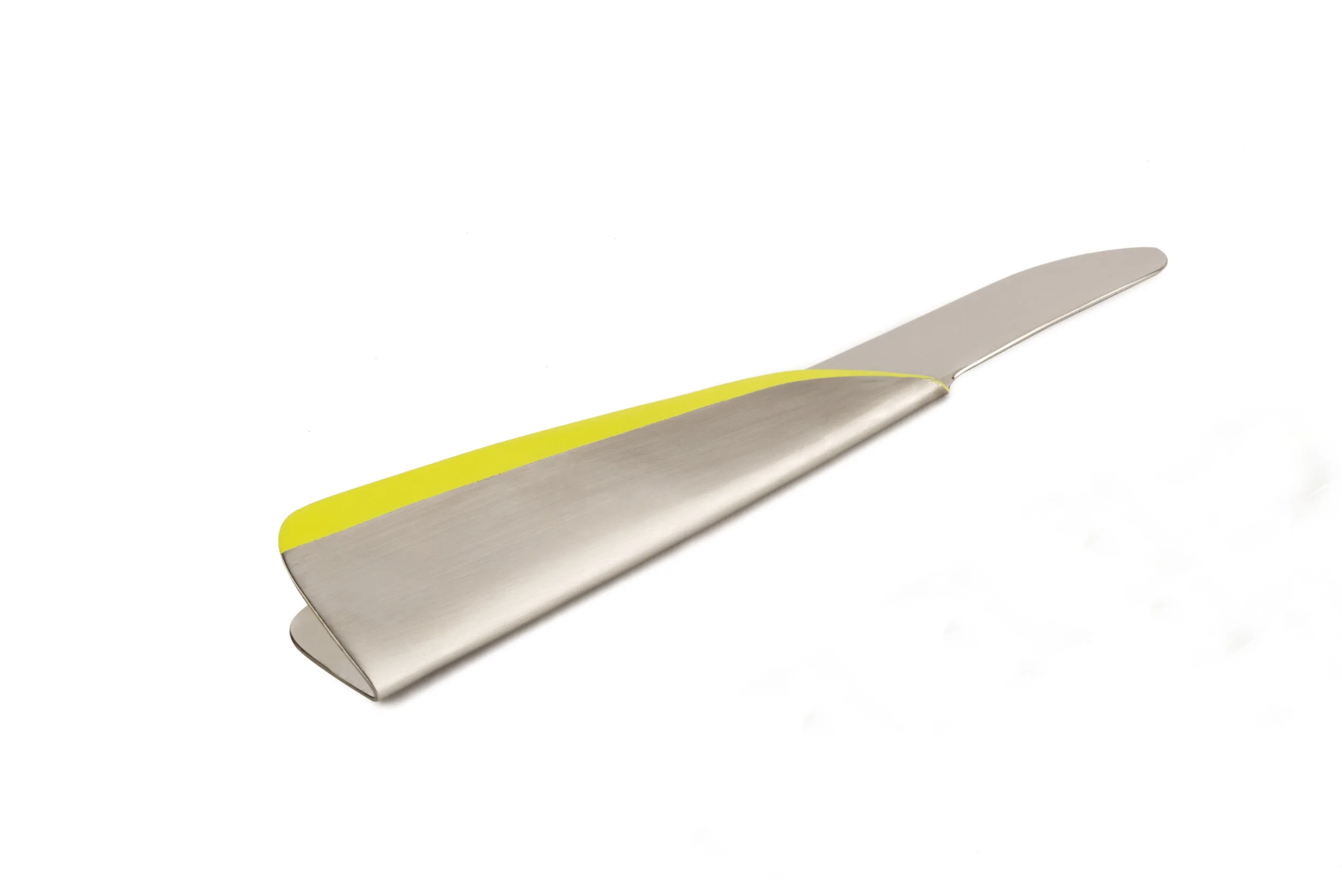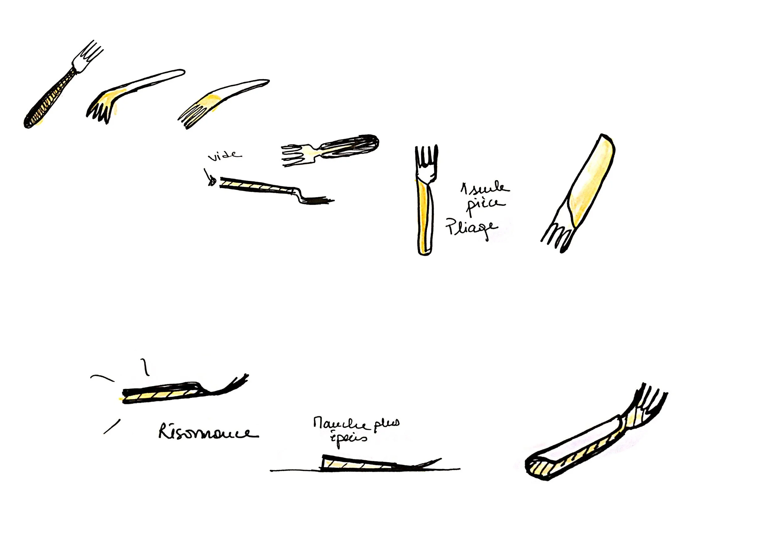 The manufacturing system consists of folding a stainless steel sheet so as to create a gap between the front surface and the back surface of the utensil. This not only generates a resonance that helps the user understand the nature of the foods on his plate but it is also a discreet and clear communication on the means of use of the products (the direction of the folds show the direction of grip).